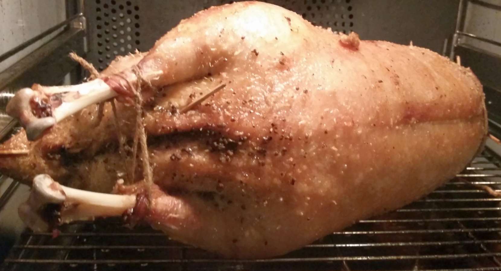 Gans mit Salzwasser-Sirupmischung einpinseln (oder Mischung aus Sojasauce und Rübensirup) und nochmals für weitere 25-30 Minuten in den Ofen geben.