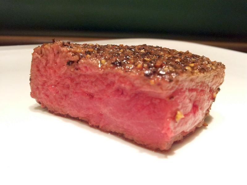 | Das Fleisch hat eine hauchdünne Kruste und ist fast vollständig roh. | Das Fleisch hat eine dünne, knusprige Kruste, zum Kern hin rosa, innen fast blutig. | Das Fleisch hat eine dünne, knusprige Kruste und ist innen durchgängig rosa. | Das Fleisch hat eine knusprige Kruste, der Kern ist nur noch leicht rosa. | Das Fleisch hat eine knusprige Kruste, der Kern ist nur noch leicht rosa. | Das Fleisch hat eine Kruste und ist durch und durch gebraten. | |