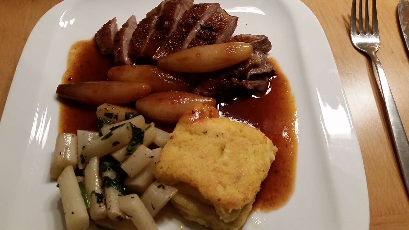 Gänsebrust, rosa gebacken mit Rot...