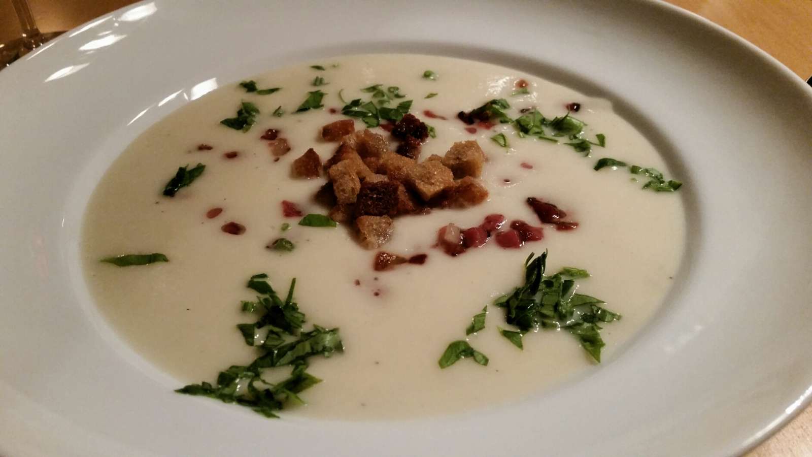 Selleriecremesuppe frittierte Selleriespäne Schweinefiletmedillons im Sauerteigbrotscheiben